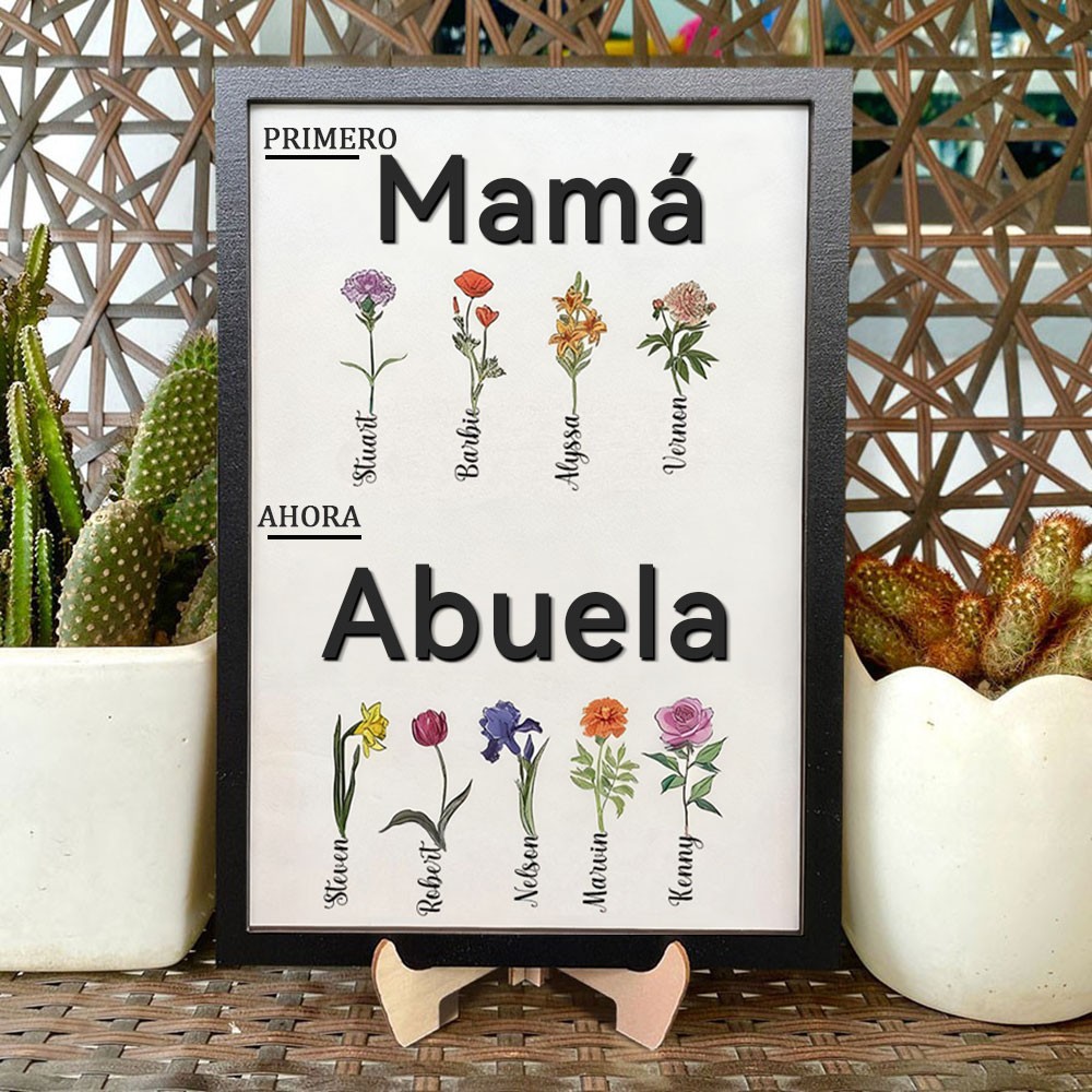 Marco de madera personalizado con acuarela de flor de nacimiento, 'Primero Mamá, Ahora Abuela', con nombres. Un regalo de cumpleaños único para mamá o abuela. Ideas de regalo para el Día de la Madre.