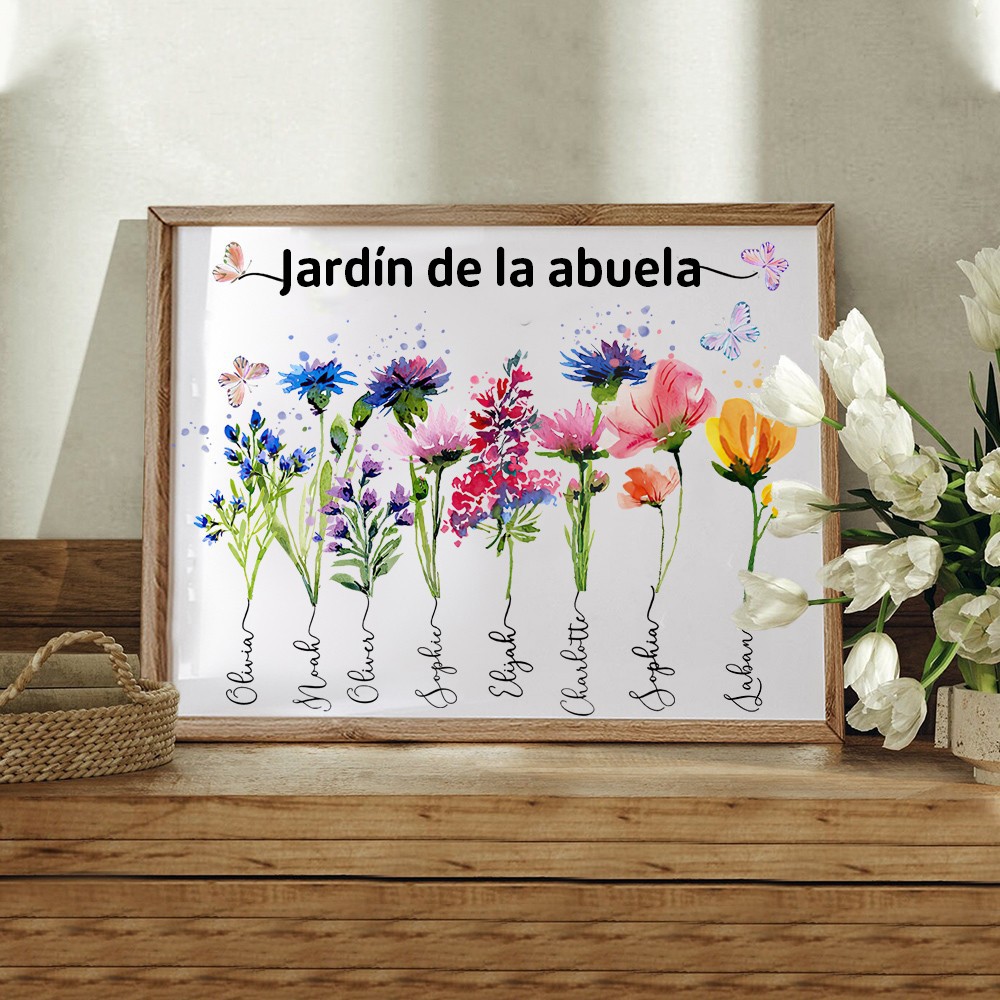 Placa Enmarcada Personalizada con la Flor de Nacimiento para Mamá y Abuela con Nombres de los Nietos, Impresión en Madera "Jardín de la abuela", Regalo Ideal para el Día de la Madre y la Familia.