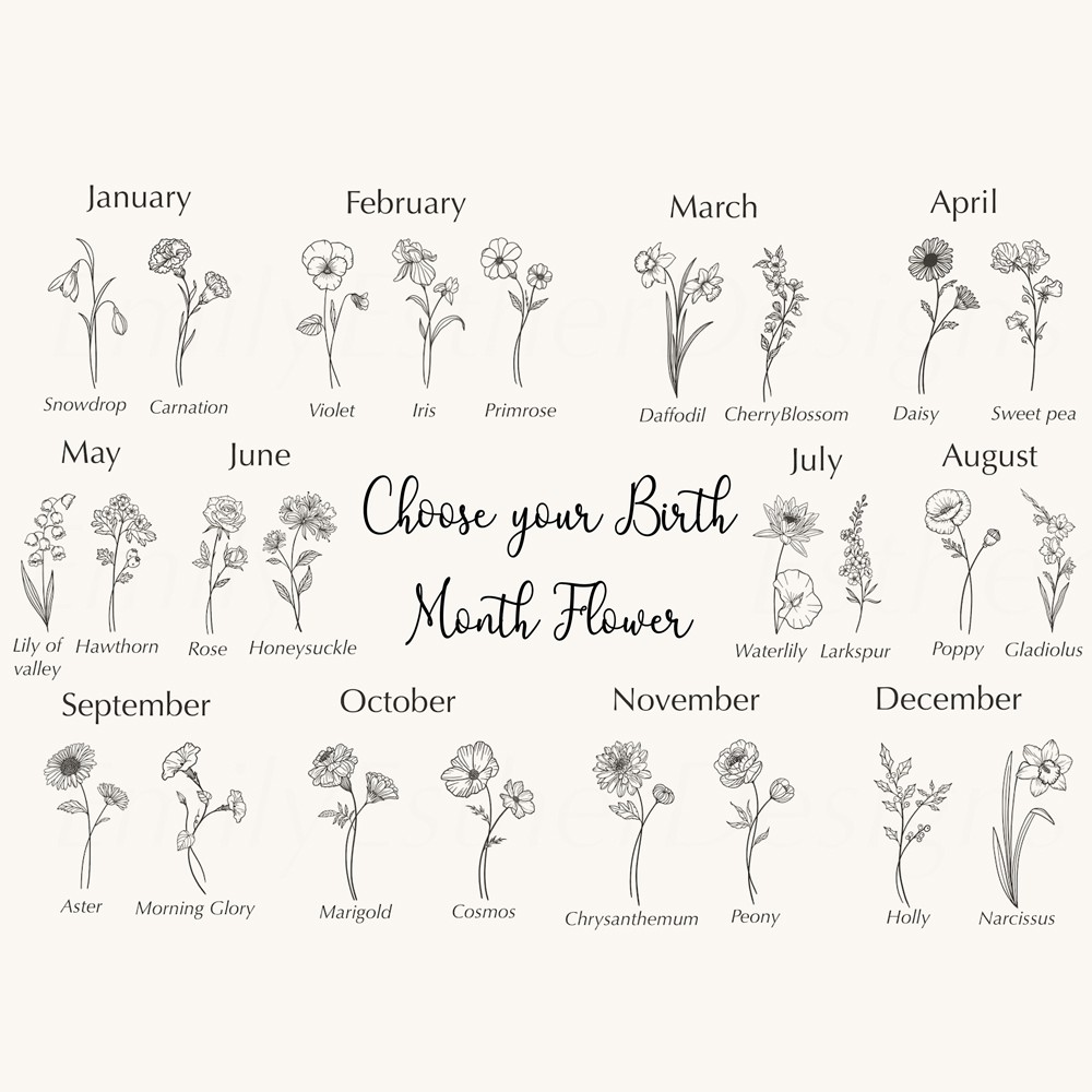 -- Select 3rd Flower Type Line 2 -- January-Carnation January-Snowdrop February-Iris February-Primrose February-Violet March-Cherry Blossom March-Daffodil April-Daisy April-Sweet Pea May-Hawthorn May-Lily of Valley June-Honeysuckle June-Rose July-Larkspur July-Waterlily August-Gladiolus August-Poppy September-Aster September-Morning Glory October-Cosmos October-Marigold November-Chrysanthemum November-Peony December-Holly December-Narcissus