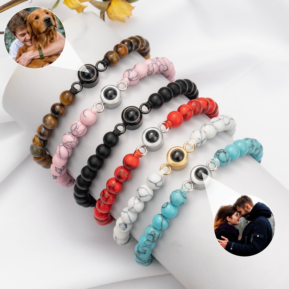 Bracelet de projection photo personnalisé en perles de pierre œil de tigre avec image à l'intérieur Idées de cadeaux souvenirs de famille