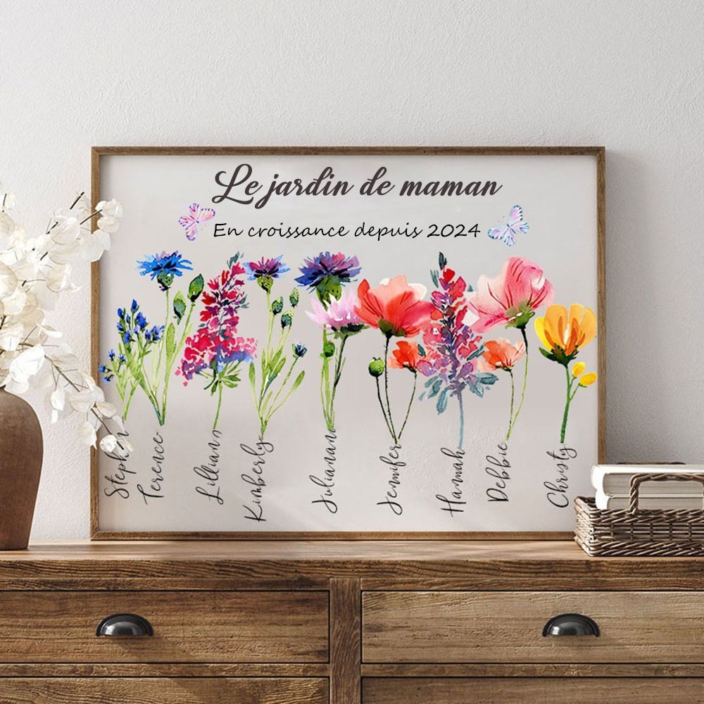 Cadre de fleurs de naissance personnalisé du jardin de grand-mère avec les noms des enfants