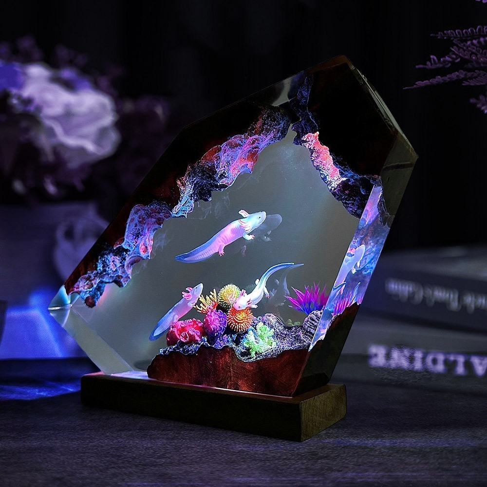 Lampe en résine et bois représentant un axolotl ou une salamandre mexicaine. Idées cadeaux de Noël, d'anniversaire