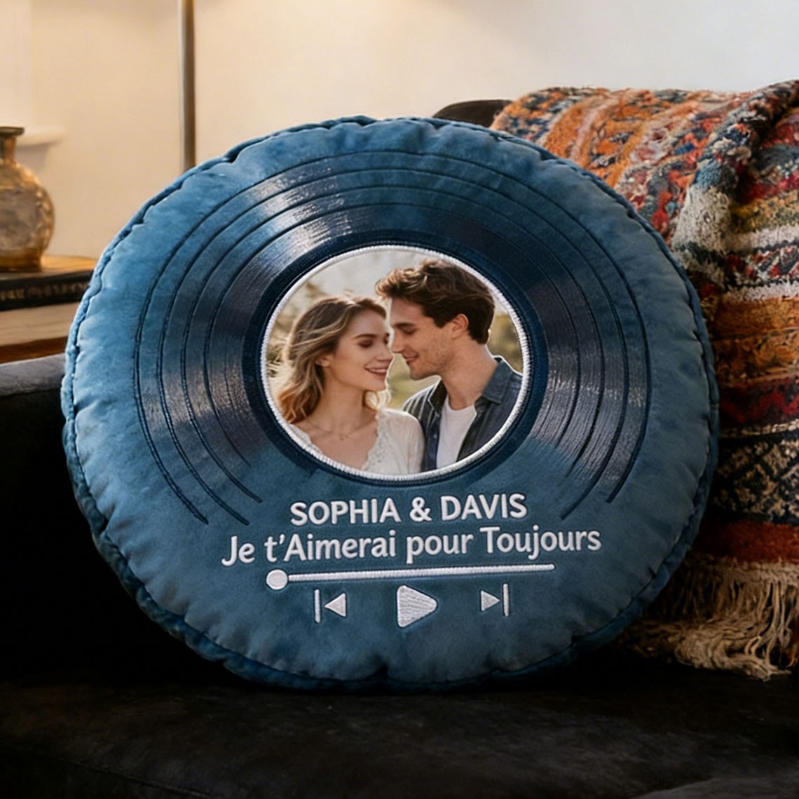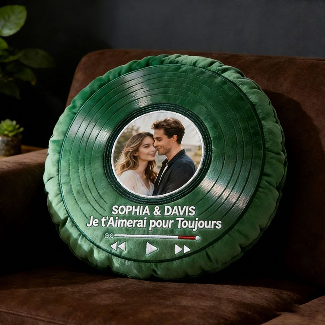 Oreiller Forme Disque Musical Photo de Couple Personnalisé avec Prénoms Cadeaux pour Anniversaire Cadeau de Saint-Valentin Cadeau-Souvenir