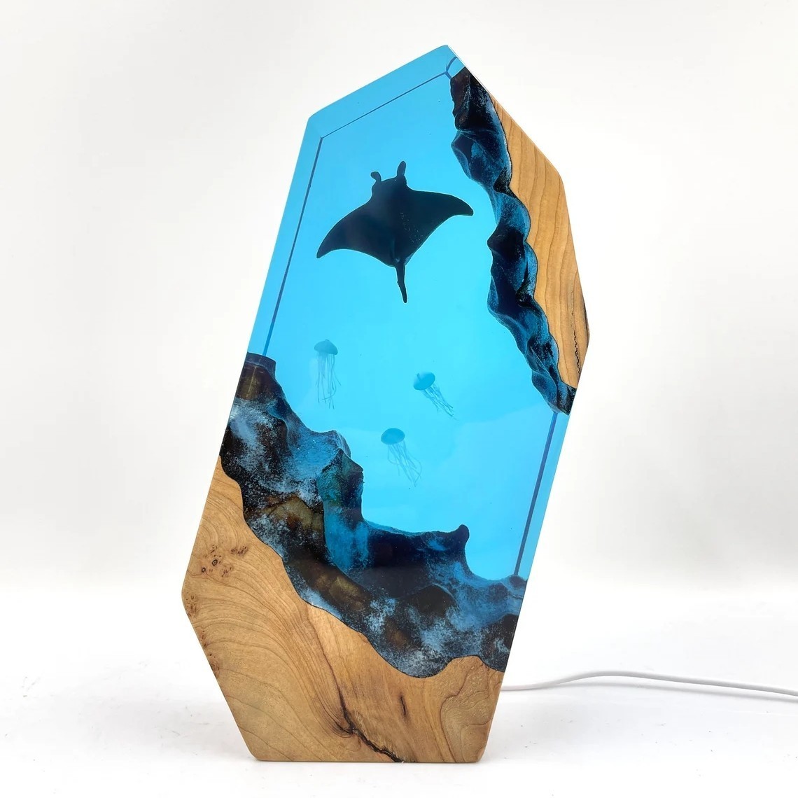 Raies Manta et méduses résine bois lampe bleu océan Miniature