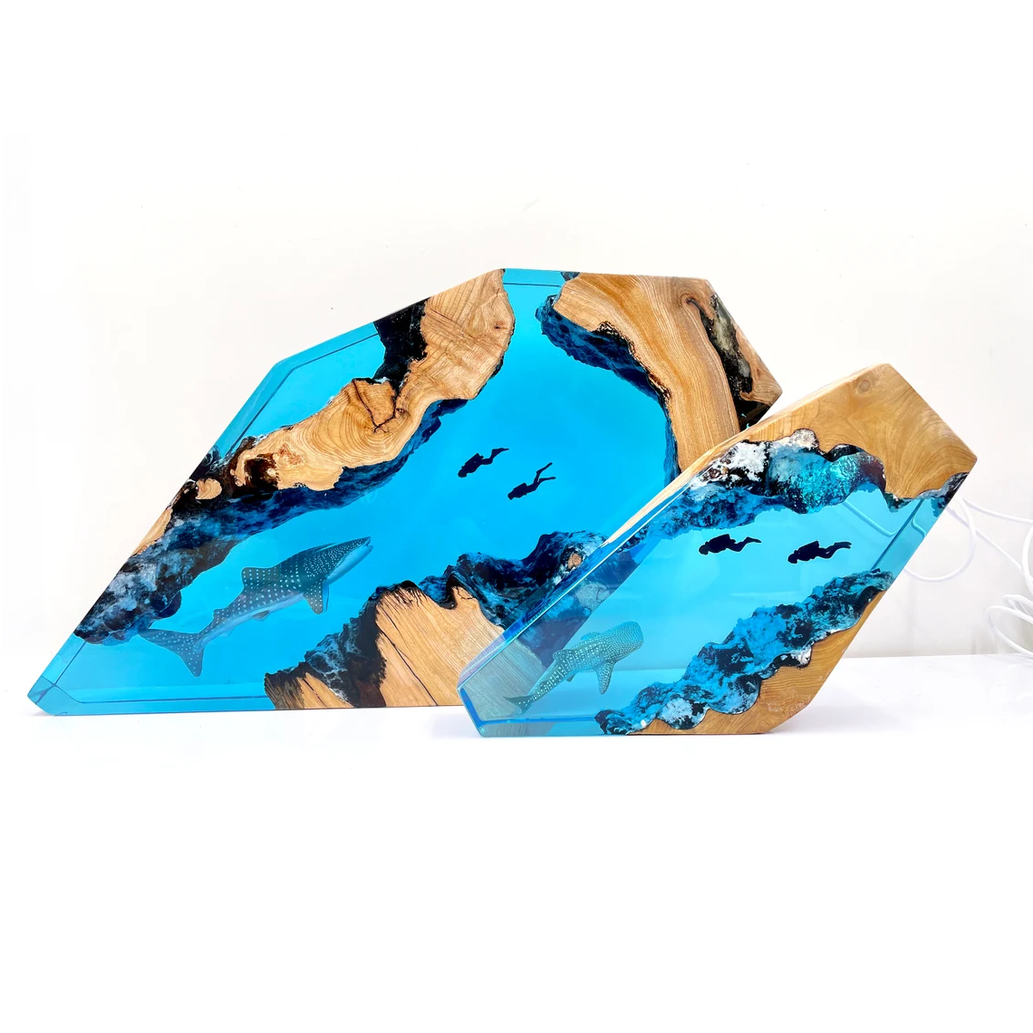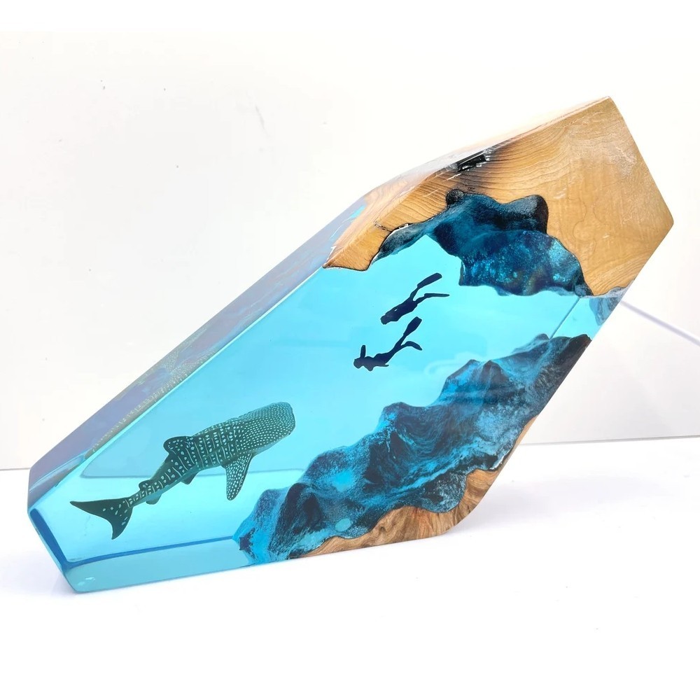 Requin Baleine Et Couple Plongeur Lampe En Bois Résine Bleu Océan Miniature