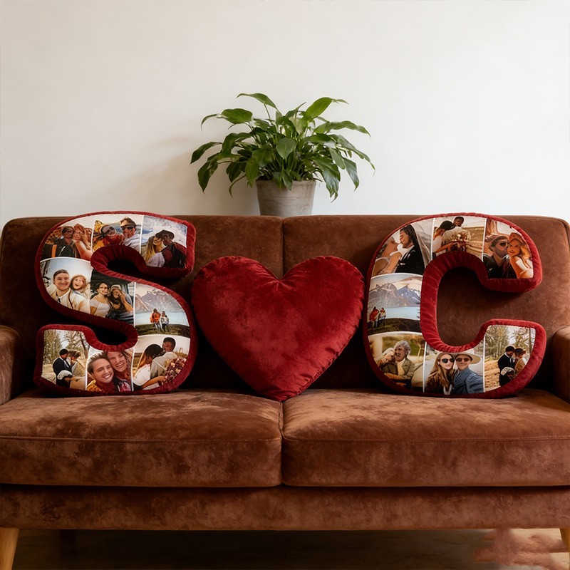 Set d'Oreillers Collage Photo Forme Lettre de Couple Personnalisé Cadeaux-Souvenirs pour Anniversaire et Saint-Valentin