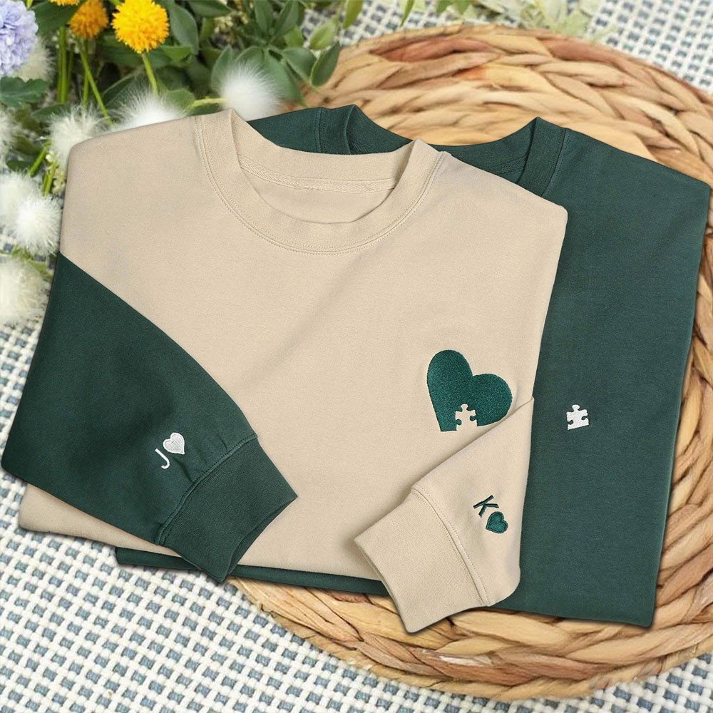 Sweat à Capuche Personnalisé avec Broderie Cœur et Pièce de Puzzle pour Couples avec Initiale sur la Manche Cadeaux pour la Saint-Valentin