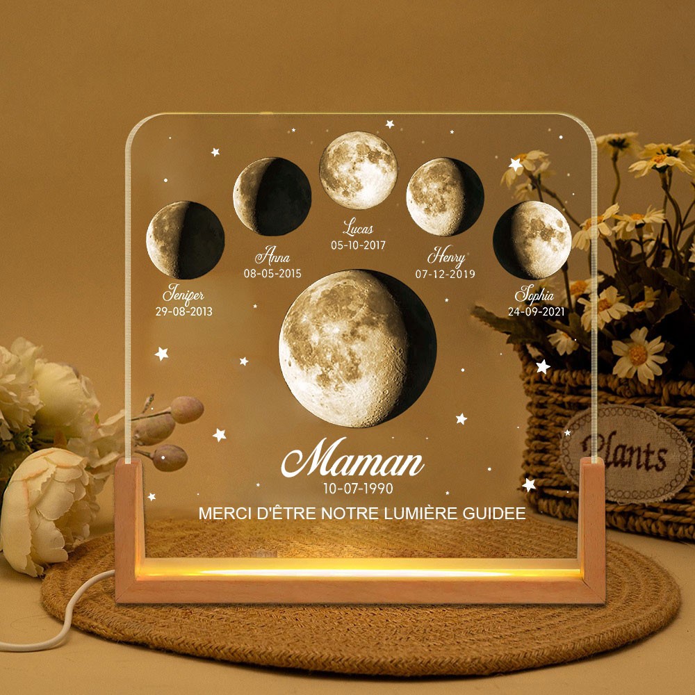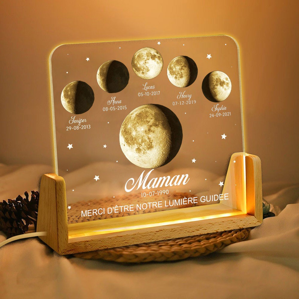 Veilleuse personnalisée avec phases de lune et date, avec prénoms d'enfants, idée cadeau pour maman, fête des mères