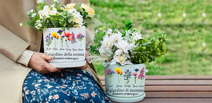 Stampa personalizzata di fiori di nascita, mini vaso per piante da giardino della nonna con nomi dei nipoti, regalo di famiglia unico per la nonna, regalo di compleanno, idee regalo per la festa della mamma