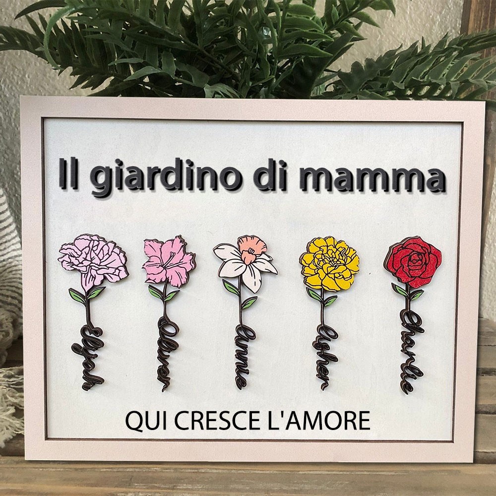 Cartello in Legno Personalizzato per la Festa della Mamma/Nonna "L'Amore Cresce Qui" con Fiori di Nascita ad Acquerello - Regalo Unico per Mamma/Nonna con Nomi