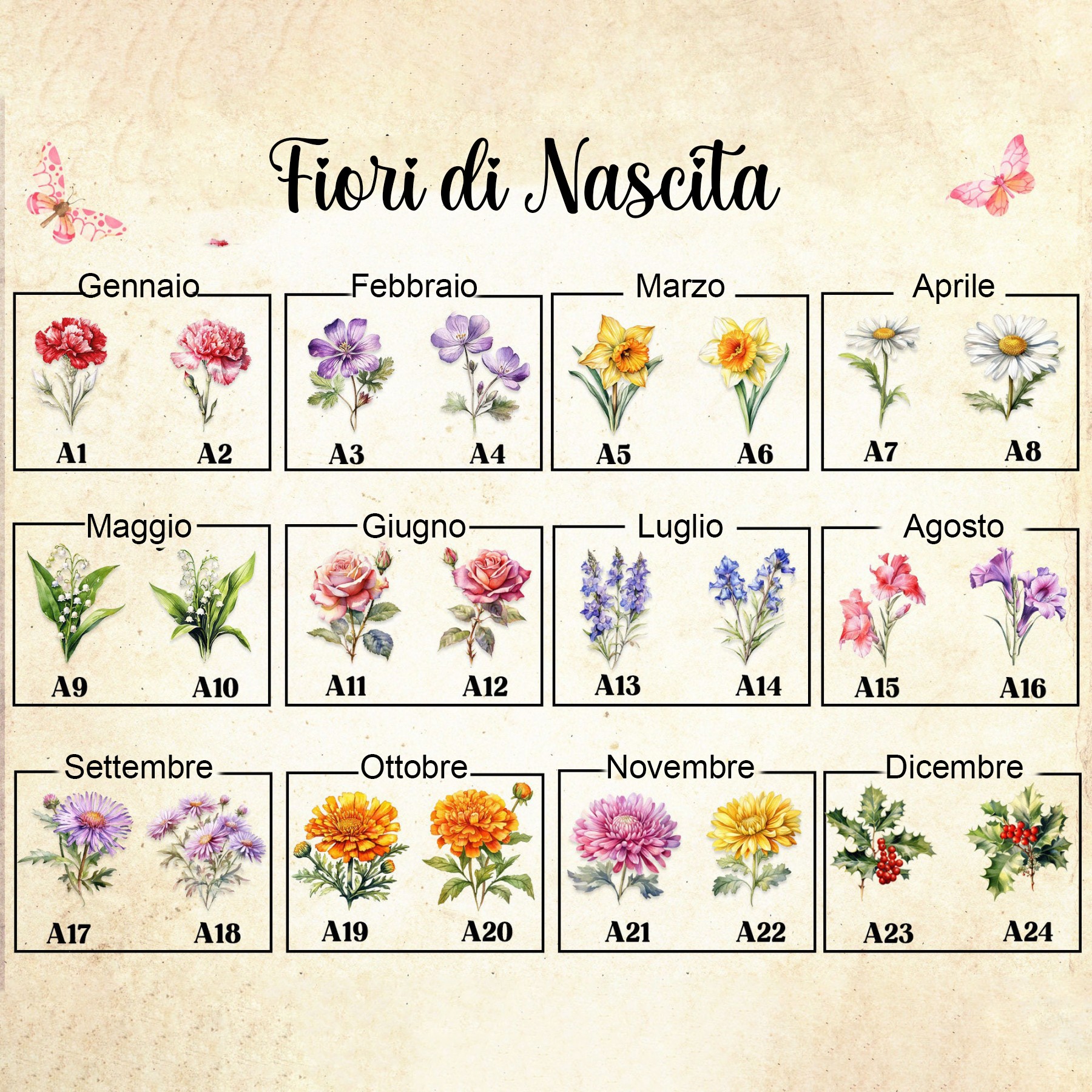 -- Seleziona 1° Tipo di Fiore Riga 1 -- Gennaio-A1 Gennaio-A2 Febbraio-A3 Febbraio-A4 Marzo-A5 Marzo-A6 Aprile-A7 Aprile-A8 Maggio-A9 Maggio-A10 Giugno-A11 Giugno-A12 Luglio-A13 Luglio-A14 Agosto-A15 Agosto-A16 Settembre-A17 Settembre-A18 Ottobre-A19 Ottobre-A20 Novembre-A21 Novembre-A22 Dicembre-A23 Dicembre-A24