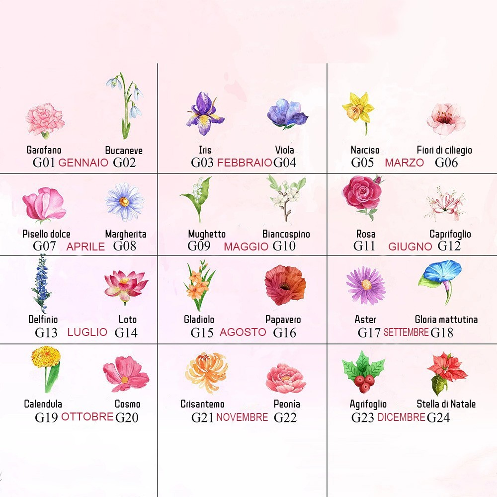 -- Seleziona 12° Tipo di Fiore -- Gennaio-Garofano Gennaio-Bucaneve Febbraio-Iris Febbraio-Viola Marzo-Ciliegio Marzo-Narciso Aprile-Pisello odoroso Aprile-Margherita Maggio-Mughetto Maggio-Biancospino Giugno-Caprifoglio Giugno-Rosa Luglio-Speronella Luglio-Loto Agosto-Papavero Agosto-Gladiolo Settembre-Aster Settembre-Ipomea Ottobre-Calendula Ottobre-Cosmos Novembre-Crisantemo Novembre-Peonia Dicembre-Bacca di Agrifoglio Dicembre-Stella di Natale