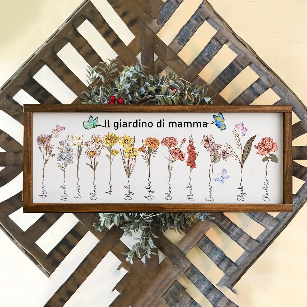 Cornice in legno personalizzata con fiore di nascita "Il Giardino della Nonna" con i nomi dei nipoti - Regalo unico per la famiglia per la mamma, la nonna, regalo per la festa della mamma