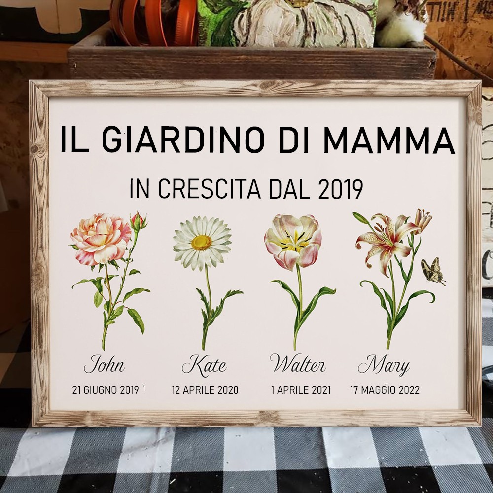 Cerchi un'idea regalo sentita per la Festa della Mamma? La nostra cornice personalizzata in legno con fiori del mese di nascita per il giardino è la scelta perfetta! Questo regalo di famiglia personalizzato è l'ideale per la nonna, la mamma o qualsiasi donna speciale nella tua vita. Celebra la bellezza della famiglia con questoA charming wooden sign featuring birth month flowers. Personalizzalo con i nomi dei tuoi cari per un tocco davvero unico. Sorprendi tua madre con un regalo che conserverà per sempre! Ordina ora e rendi questa festa della mamma indimenticabile.