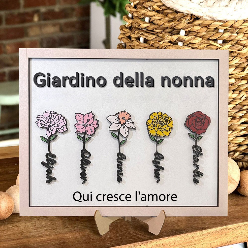 Cornice personalizzata 'Giardino della Nonna' con fiori di nascita e nomi dei nipotini – Regalo unico e ricordo per mamma, nonna, regalo per la Festa della Mamma.