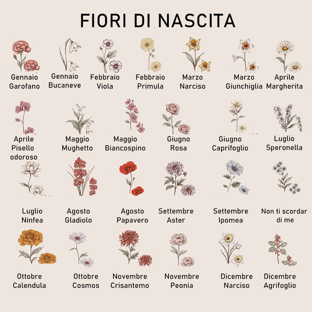 Ogni fiore simboleggia il viaggio e la crescita unici dei loro cari, formando una splendida rappresentazione dell'amore e dell'unità della vostra famiglia.