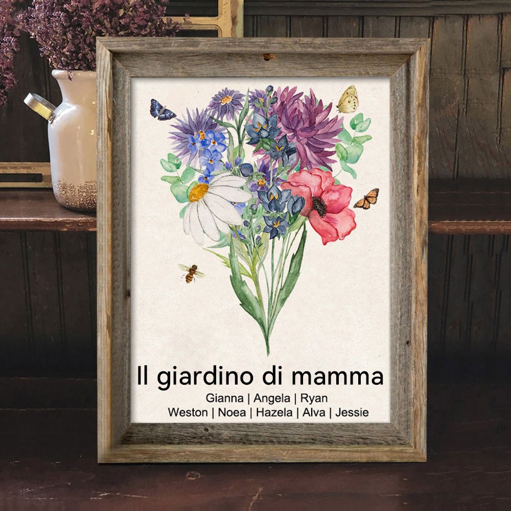 Insegna personalizzata con cornice a bouquet ad acquerello di fiori di nascita per il giardino della mamma, regalo unico per la nonna, la mamma, regalo speciale ricordo, regalo per la festa della mamma.