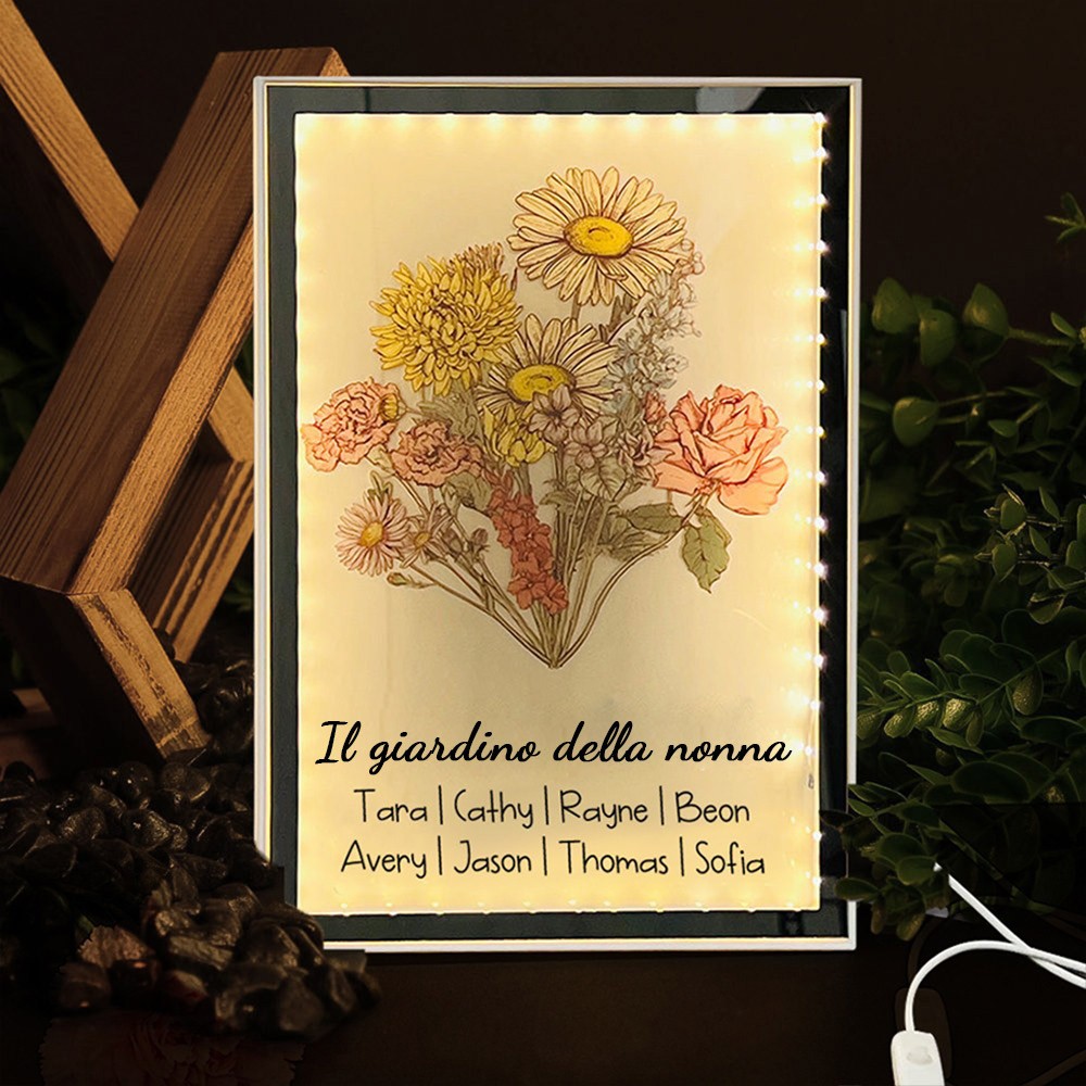 Lampada da notte con stampa floreale personalizzata del giardino della nonna, bouquet di famiglia con nomi dei nipoti, regalo di compleanno per la mamma, nonna, regalo unico per la festa della mamma