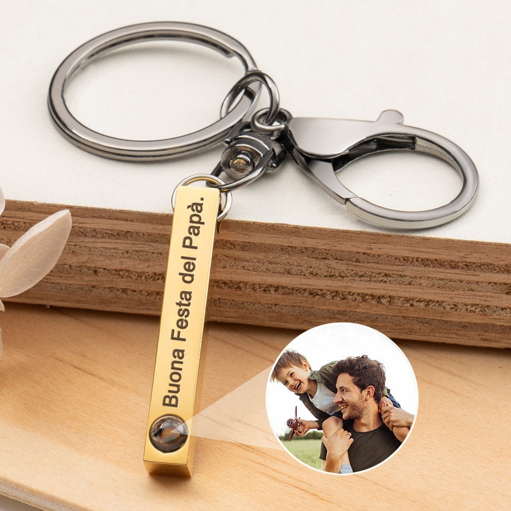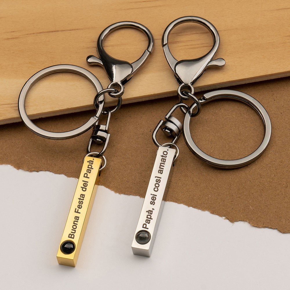 Portachiavi con proiezione di foto su barra personalizzata con nomi incisi. Regalo unico per la festa del papà