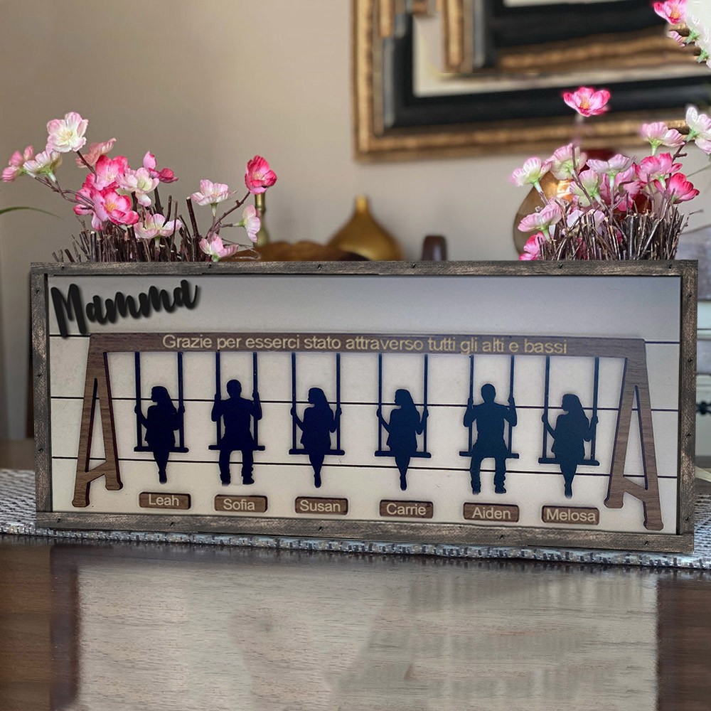 Set di altalene in legno personalizzato per la mamma, cartello con cornice e nomi dei bambini, regalo ricordo della famiglia. Regalo unico per la festa della mamma per la neo mamma