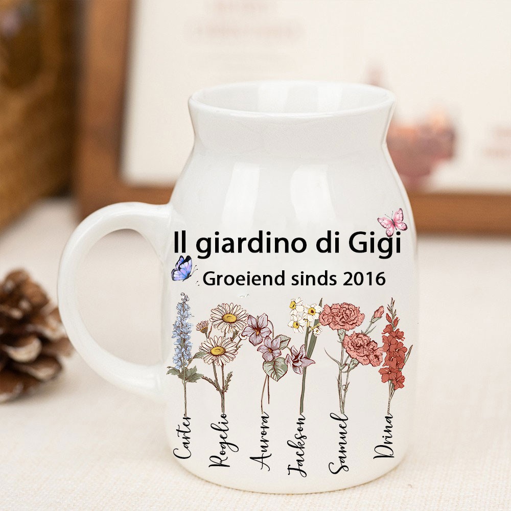 Stampa artistica personalizzata ad acquerello con vaso di fiori per la nascita del giardino della nonna con i nomi dei bambini, ricordo di famiglia, regalo per la mamma, nonna, idea regalo unica per la festa della mamma.