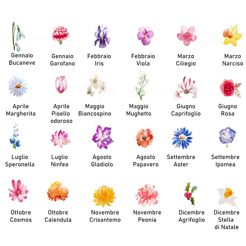 -- Seleziona 11° Tipo di Fiore -- Gennaio-Bucaneve Gennaio-Garofano Febbraio-Iris Febbraio-Viola Marzo-Ciliegio Marzo-Narciso Aprile-Margherita Aprile-Pisello odoroso Maggio-Biancospino Maggio-Mughetto Giugno-Caprifoglio Giugno-Rosa Luglio-Speronella Luglio-Ninfea August-Gladioli Agosto-Papavero Settembre-Aster Settembre-Ipomea Ottobre-Cosmos Ottobre-Calendula Novembre-Crisantemo Novembre-Peonia Dicembre-Bacca di Agrifoglio Dicembre-Stella di Natale