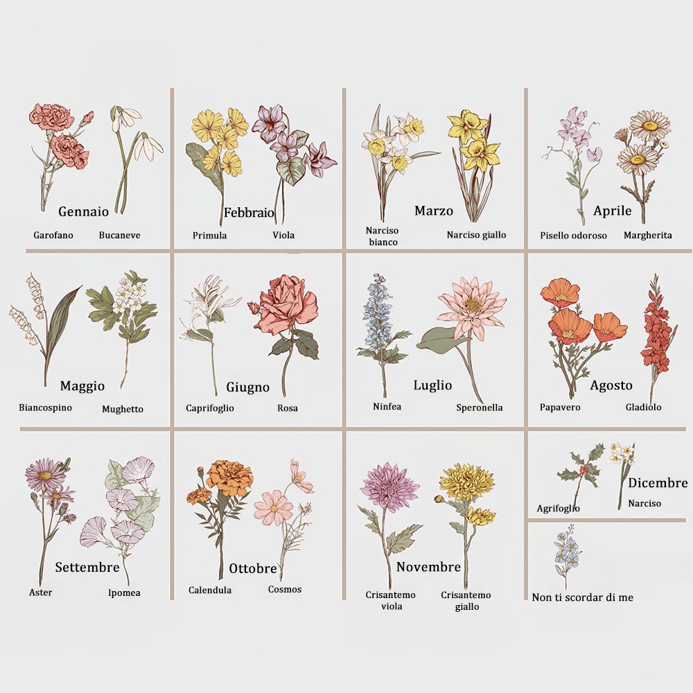 -- Seleziona 14° Tipo di Fiore -- Gennaio-Garofano Gennaio-Bucaneve Febbraio-Primula Febbraio-Viola Marzo-Narciso bianco Marzo-Narciso giallo Aprile-Pisello odoroso Aprile-Margherita Maggio-Biancospino Maggio-Mughetto Giugno-Caprifoglio Giugno-Rosa Luglio-Ninfea Luglio-Speronella Agosto-Papavero Agosto-Gladiolo Settembre-Ipomea Settembre-Aster Ottobre-Cosmos Ottobre-Calendula Novembre-Crisantemo giallo Dicembre-Crisantemo viola Dicembre-Narciso Dicembre-Agrifoglio Non ti scordar di me