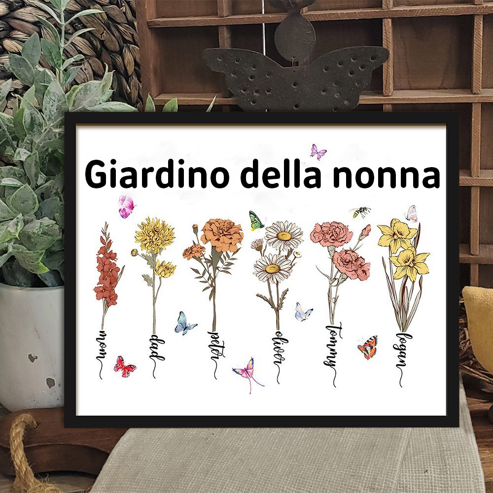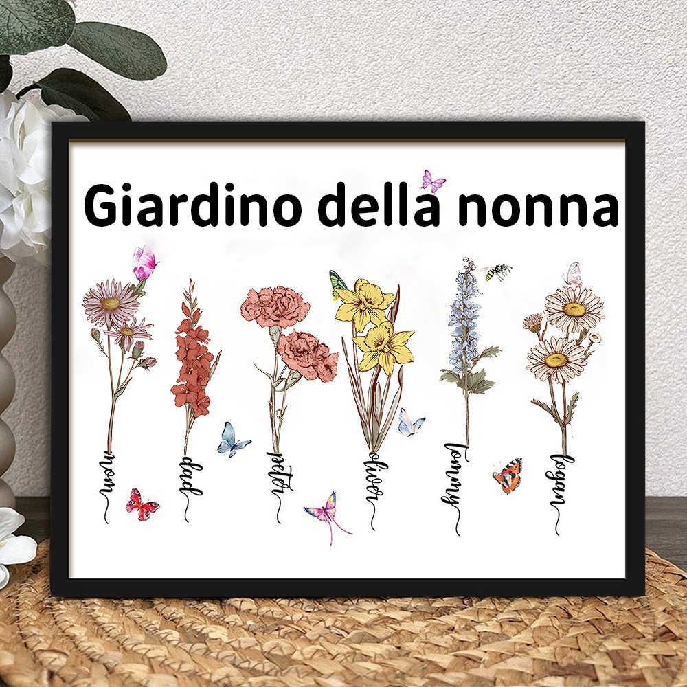 Stampa artistica personalizzata del giardino fiorito del mese di nascita con nomi dei bambini, regalo unico su tavoletta di legno per mamma, nonna, festa della mamma.