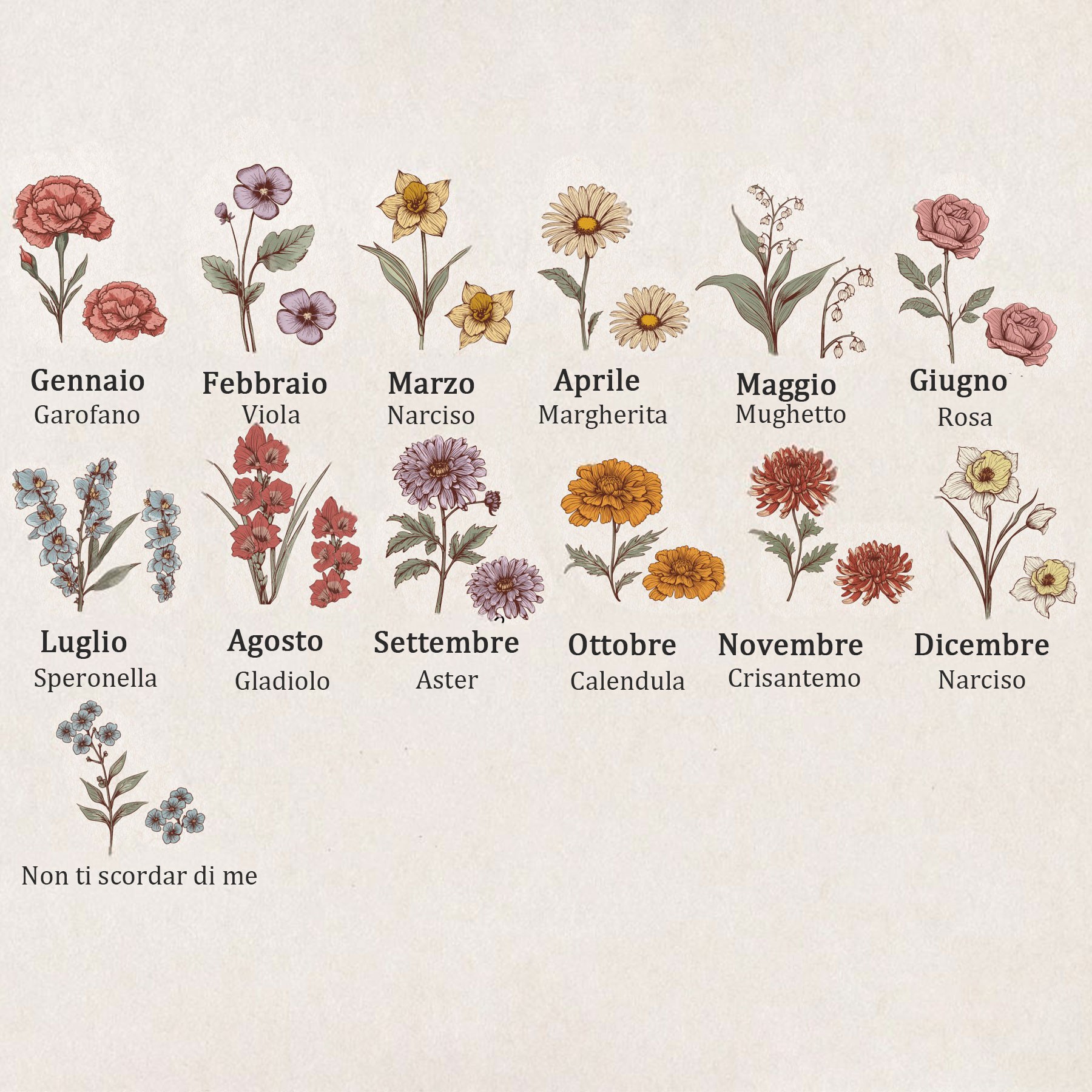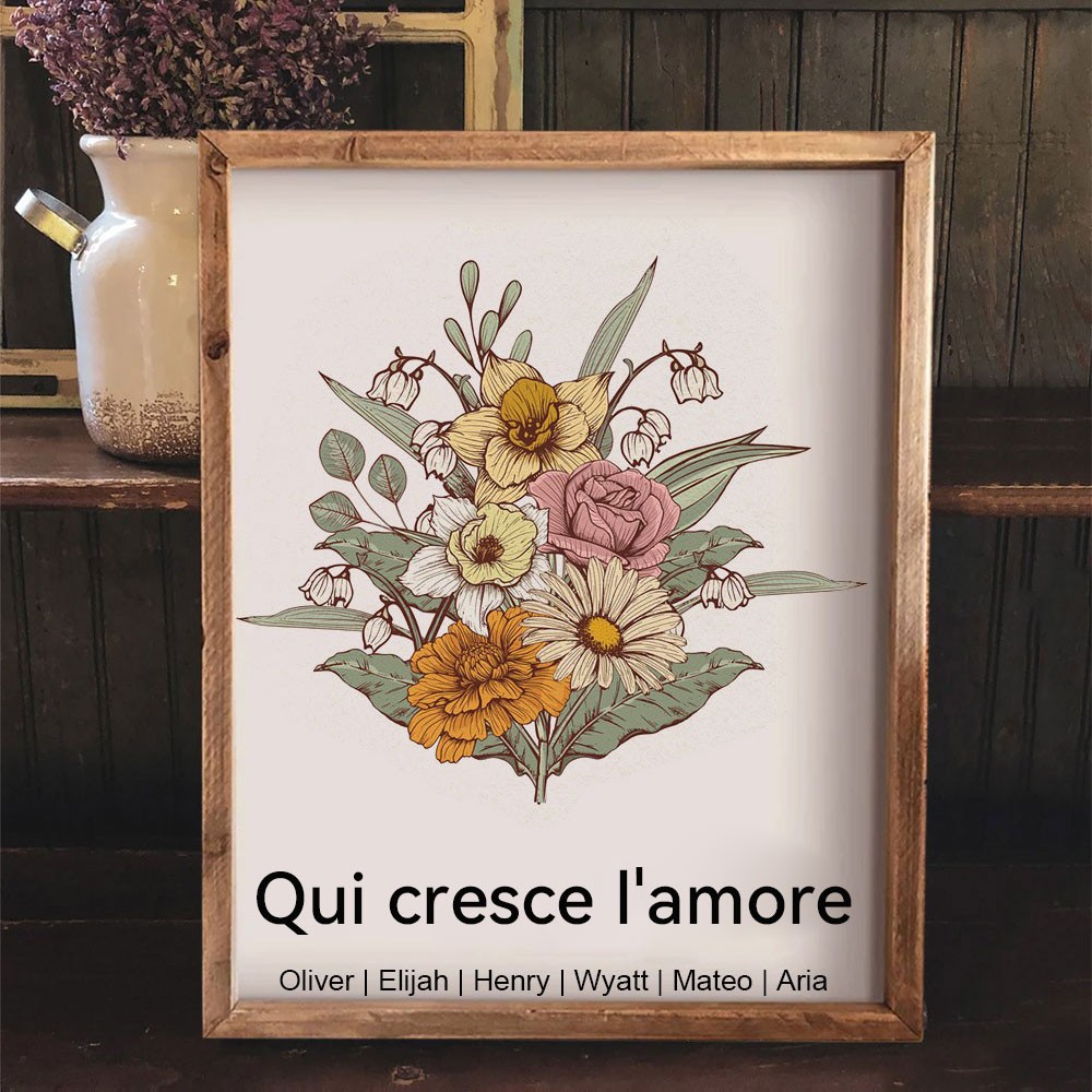 Stampa Artistica Personalizzata: Il Bouquet del Giardino della Nonna con Fiori di Nascita, Cornice con i Nomi dei Nipoti. Un Regalo Unico per Mamma, Nonna, Regalo per la Festa della Mamma.