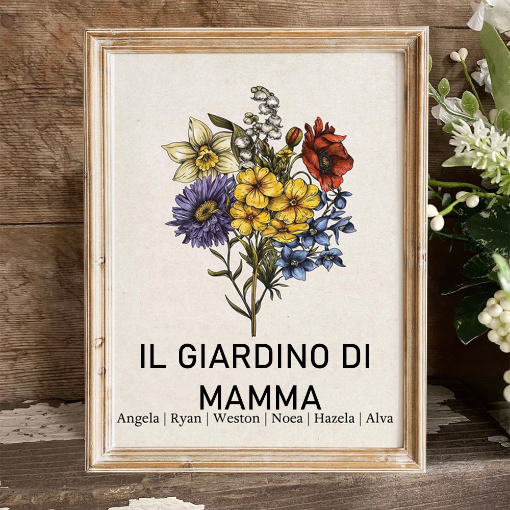 Stampa artistica personalizzata "Il Giardino della Mamma - La Nostra Famiglia" - Cornice con bouquet di fiori del mese di nascita e nomi dei bambini - Regali unici per mamma e nonna - Idee regalo significative per Natale.