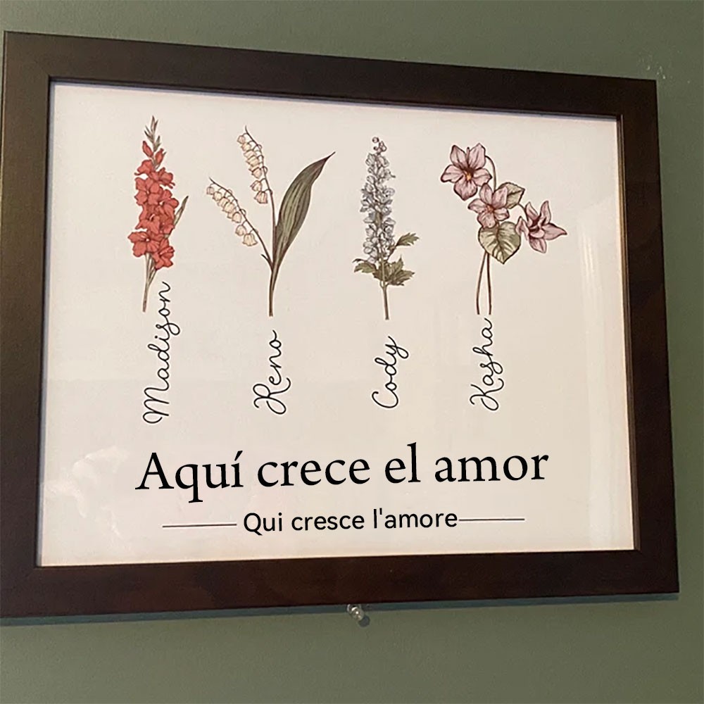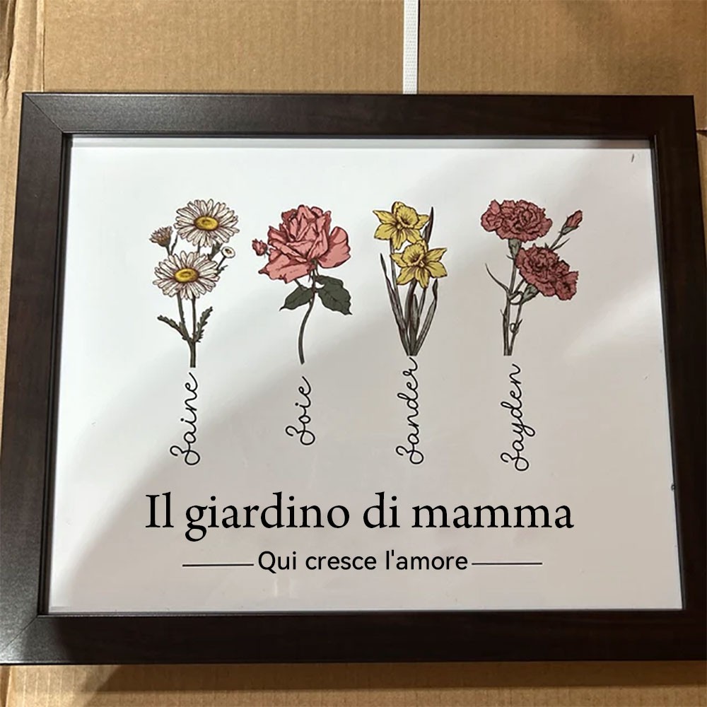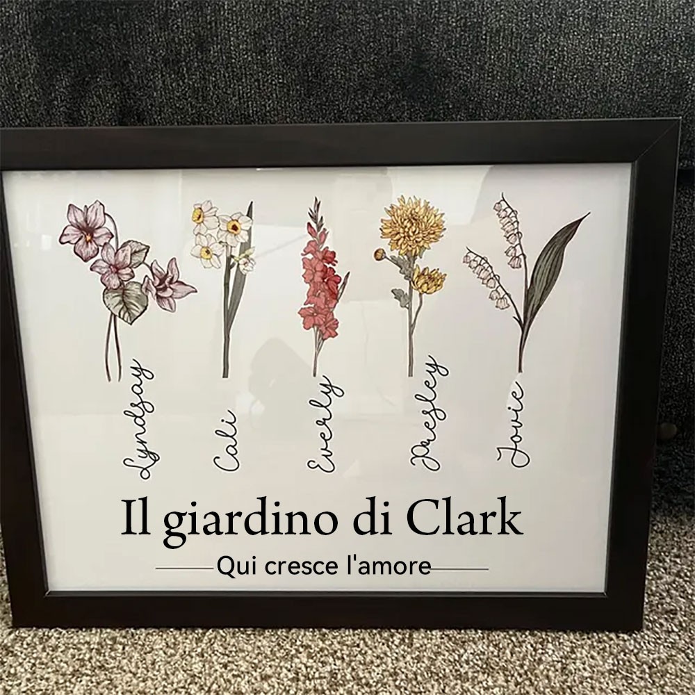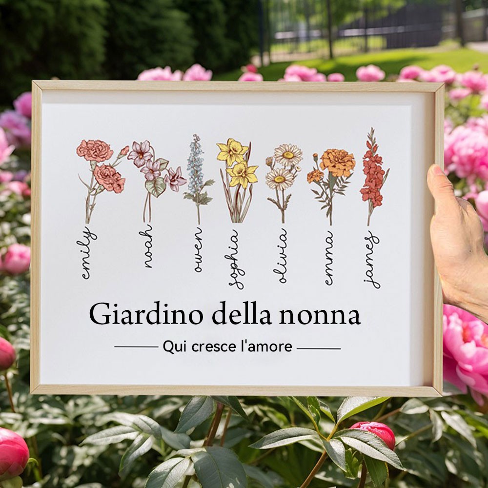Stampa Artistica Personalizzata 'Il Giardino della Nonna' con Fiori del Mese di Nascita, Cornice con Nomi dei Nipoti – Regali di Compleanno Personalizzati per Mamma e Nonna, Idee Regalo di Natale.