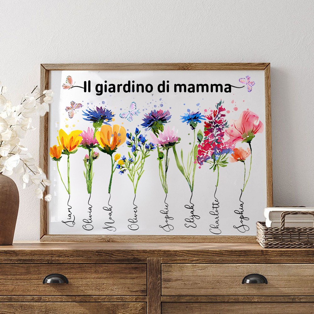 Stampa Artistica Personalizzata 'Il Giardino della Nonna' con Fiori di Nascita e Nomi dei Nipotini, Segno Incorniciato in Legno – Regalo Unico per Mamma, Nonna, Festa della Mamma.