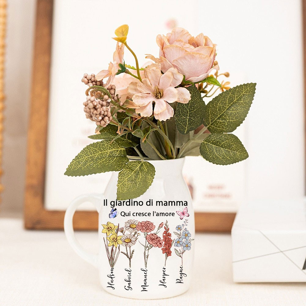 Stampa artistica personalizzata "L'amore cresce qui" con il giardino della mamma, fiore di nascita, vaso da interno con nomi dei bambini, regalo di famiglia unico, regalo di compleanno per mamma, nonna, regali per la festa della mamma.