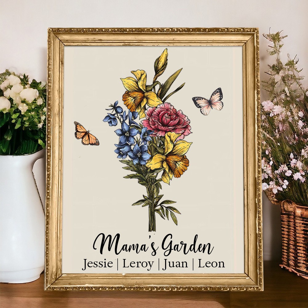 Mama's Garden Birth Flower Bouquet Frame Sign with Kids Names Personalized Gifts for Mom Christmas Gift