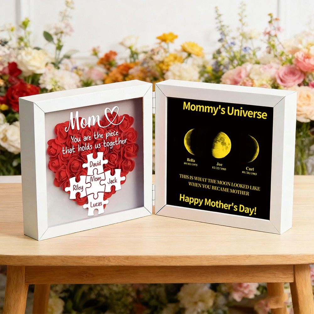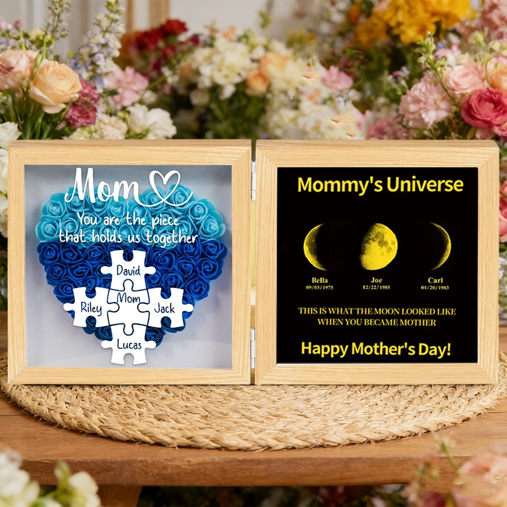 Mom You Are The Piece That Holds Us Together Custom Puzzle Name Flower Shadow Box with Moon Phase Frame for Mom Mother's Day Gifts