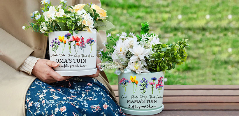 Gepersonaliseerde oma's tuin kunstprint geboortebloem familie binnenvaas met namen van kleinkinderen uniek cadeau voor mama oma Moederdag cadeaus