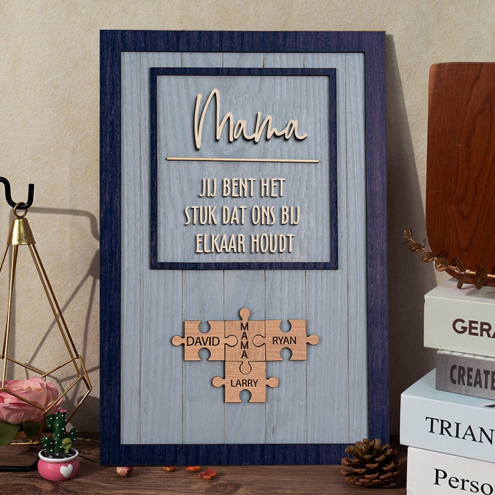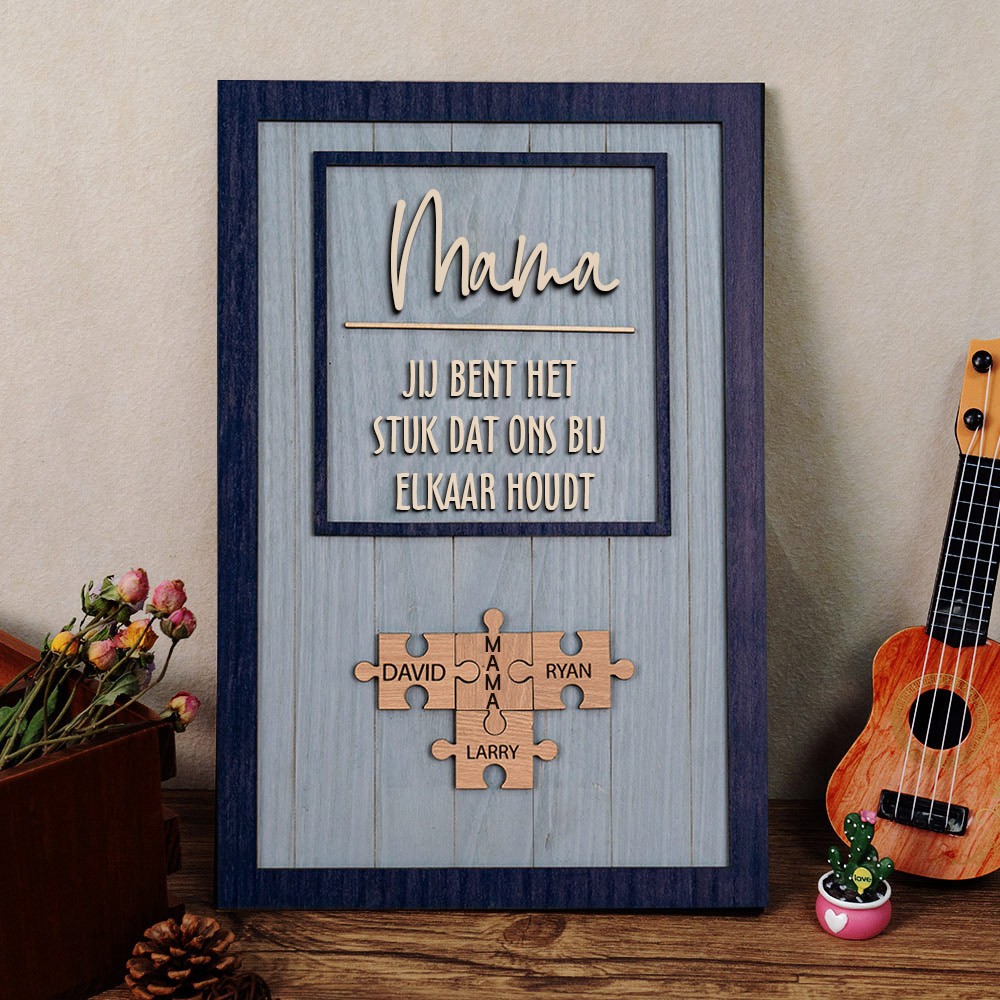 Aangepaste houten puzzelstukken "Mama, jij bent de stukjes die ons samenhouden" met gegraveerde namen van kinderen, een uniek gezinsgeschenk voor mama, oma, cadeau-ideeën voor Moederdag.