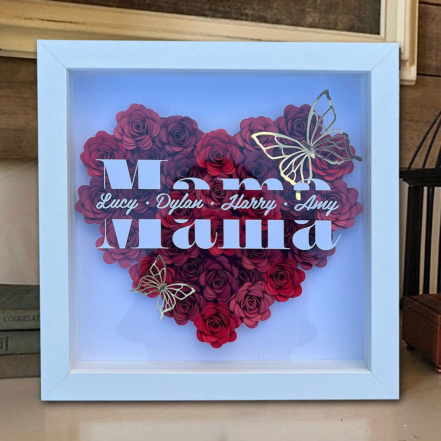 Aangepaste vlindermoeder hartvormige bloemenschaduwdoos met kindernamen voor moeder en oma Unieke kerstcadeau-ideeën