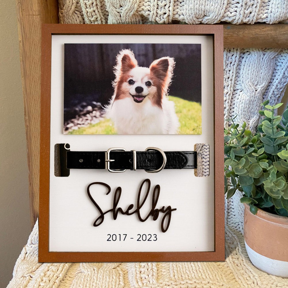 Aangepaste houten huisdier gedenkfotolijst met halsbandhouder Cadeau-ideeën voor het verlies van een huisdier