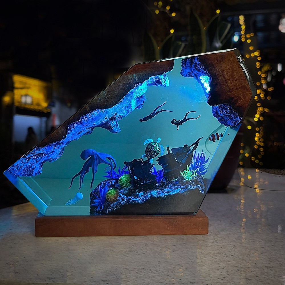 Epoxyhars & Houten Nachtlamp met Octopus en Duikers | Uniek Cadeau voor Verjaardag en Kerst
