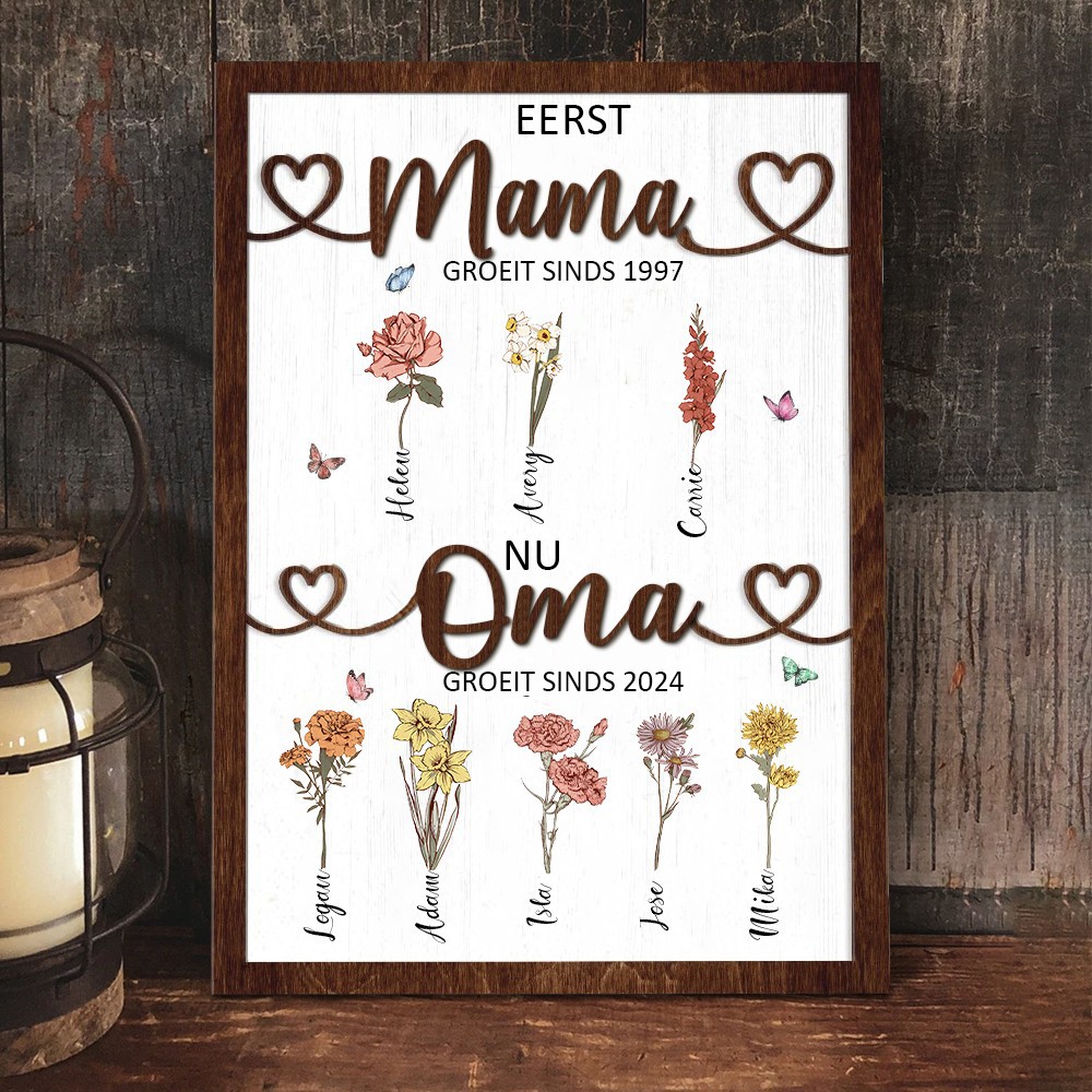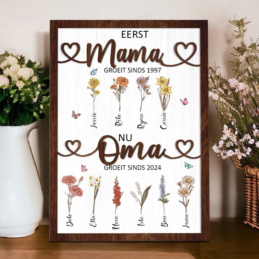 Gepersonaliseerd houten geboortebord met bloemenprint, eerste moeder, nu oma, met kindernamen, uniek verjaardagscadeau voor moeder, oma, babyshowercadeau, cadeau-ideeën voor Moederdag