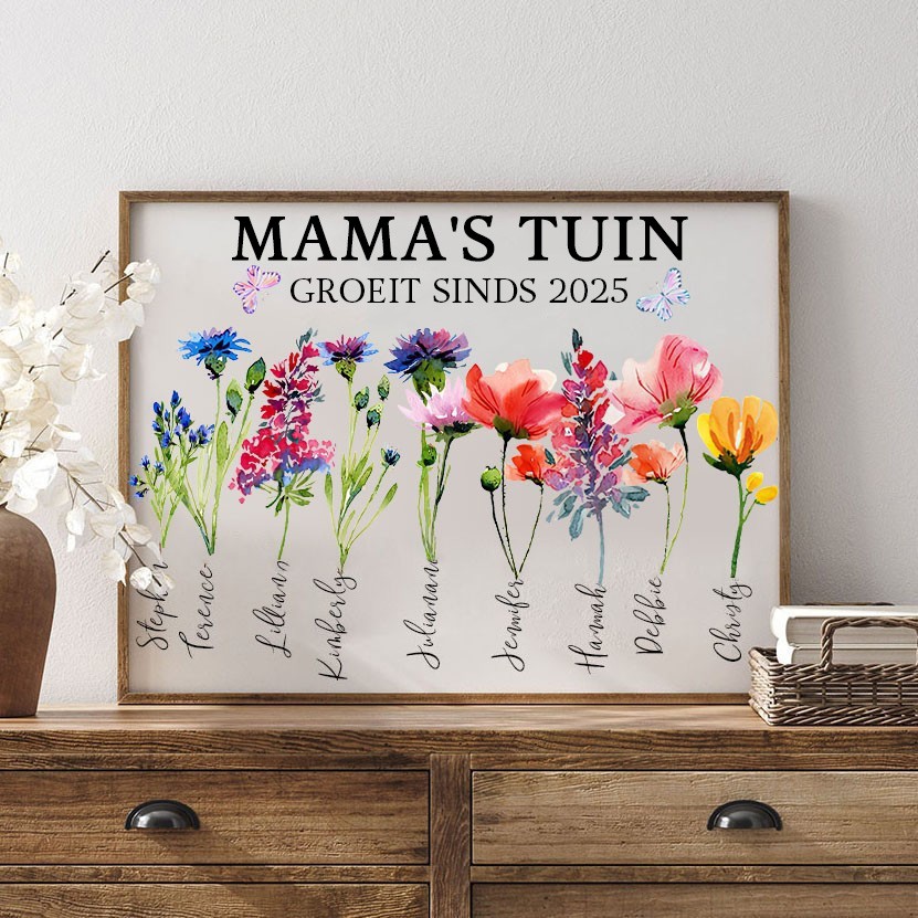Gepersonaliseerd houten bord met bloemenprint en de namen van de kleinkinderen in de vorm van een oma's tuin. Uniek verjaardagscadeau voor mama. Oma en mama, zwangerschapscadeau. Ideeën voor Moederdagcadeaus.