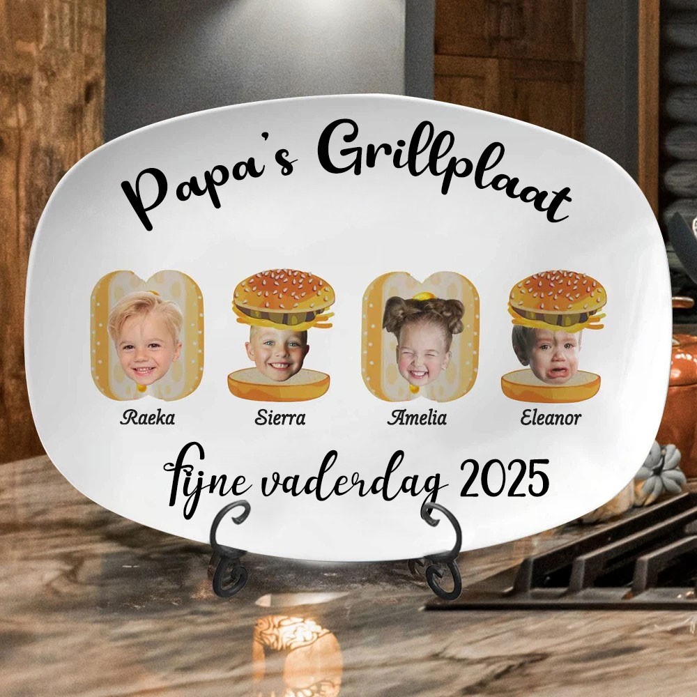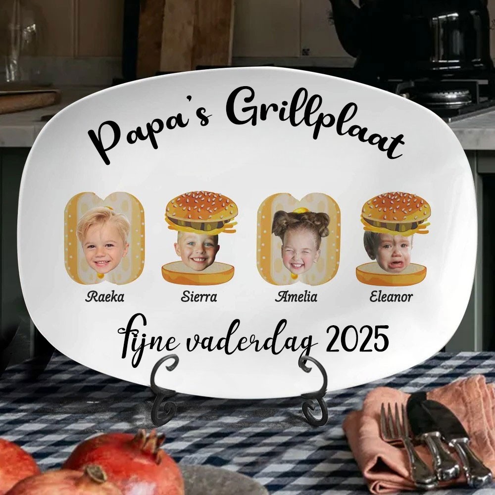 Gepersonaliseerde BBQ-schaal voor vaders en kinderen, het bord is bedrukt met de naam van het kind en een foto van een grote pop, een attent cadeau voor vaderdag in de keuken van vaders.