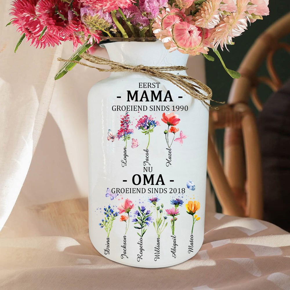 Gepersonaliseerde eerste mama, nu oma geboortebloem, familievaas met namen van kleinkinderen, uniek cadeau voor binnen voor mama, oma, Moederdag cadeau-ideeën