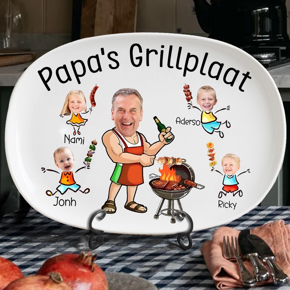 Gepersonaliseerde grillplaat voor papa, BBQ-schaal met portret en namen van de kinderen. Cadeaus voor de familiekeuken voor papa. Unieke cadeau-ideeën voor Vaderdag.