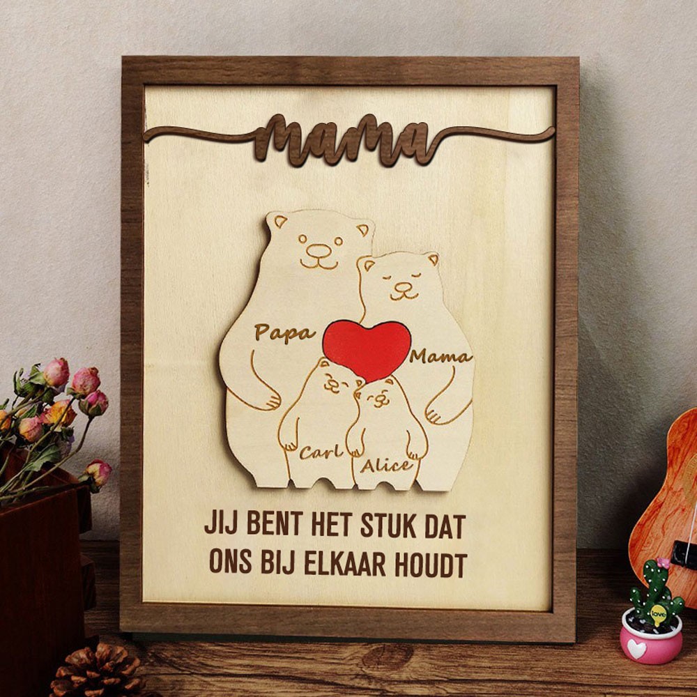 Gepersonaliseerde houten knuffelbeer familie puzzelstukjes bord met kindernamen. Uniek verjaardagscadeau voor mama, oma, Moederdagcadeau, kraamcadeau.