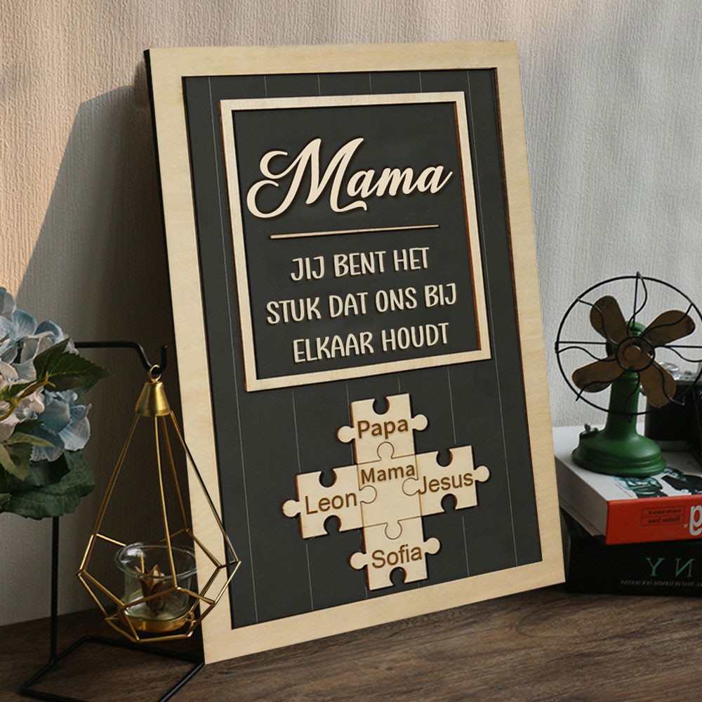 Gepersonaliseerde houten puzzel met de naam van de moeder: "Jij bent het stukje dat ons bij elkaar houdt". Unieke cadeau-ideeën voor Moederdag. Cadeau voor een nieuwe moeder.