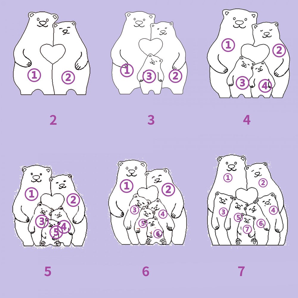 Gepersonaliseerde houten puzzelblokken met gegraveerde namen in de vorm van een berenfamilie. Uniek cadeau voor moeder en oma. Ideeën voor Moederdagcadeaus.