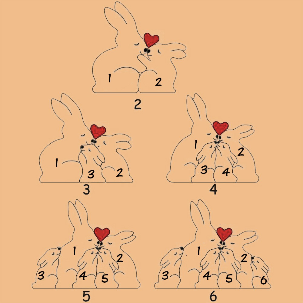 Gepersonaliseerde houten puzzelblokken met gegraveerde namen van de familie Konijn. Uniek familiecadeau voor moeder en oma. Ideeën voor Moederdagcadeaus.