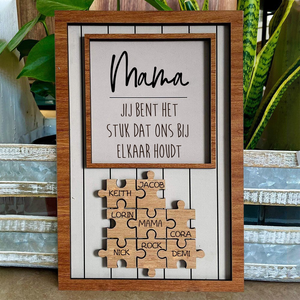 Gepersonaliseerde houten puzzelstukjes met naambordje voor mama. Uniek verjaardagscadeau voor oma. Moederdag cadeau-ideeën. Babyshower cadeau-ideeën.